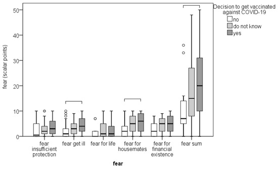 Association of dentists’ fear (scale 0 = no fear to 10 = extreme fear) with the decision to get vaccinated. Box plot represents the median and interquartile range, whiskers represent min and max values, and circles represent outliers. Parentheses connect categories that differ significantly according to Kruskal–Wallis test with Mann–Whitney post hoc test and Bonferroni correction for multiple comparisons.