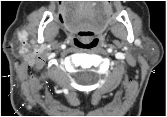 Initial post-contrast CT scan of the neck demonstrates a nodular and infiltrative lesion (black asterisks) centered in the right parotid gland, and significant surrounding fat stranding and fat plane effacement (dashed white arrows) involving the adjacent neck spaces and structures. Both the right sternocleidomastoid and posterior belly digastric muscles have ill-defined margins with the lesion (dashed black arrows). Additionally, there is thickening of the fascial plane (solid black arrow) and overlying skin (solid white arrow). On the contralateral side, there is maintenance of the fat planes (black arrowhead), normal skin (white arrowhead) and fascial plane thickness, and normal CT scan appearance of the parotid gland (white asterisk).