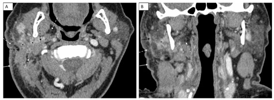 A follow-up post-contrast CT scan of the face 6 weeks later shows worsening skin thickening (white arrow), fat stranding and fat plane effacement (dashed white arrows), ill-defined margins with adjacent sternocleidomastoid and posterior belly digastric muscles with asymmetric enlargement (dashed black arrows) and increased ill-defined margins of the primary lesion in the right parotid gland (black asterisks) on the axial image (A). There is infiltration of parapharyngeal fat (dashed white arrow), increased ill-defined margins of the primary lesion in the right parotid gland (black asterisks) and fascial plane thickening (solid black arrow) on the coronal image (B).