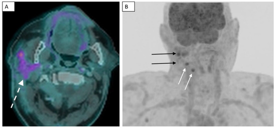 Fused PET–CT scan demonstrates FDG uptake in the infiltrative primary lesion in the right parotid gland (dashed white arrow) (A). The 3D MIP image from the PET–CT scan shows the asymmetric ill-defined FDG uptake in the parotid gland and adjacent soft tissues of the right neck (solid black arrows), as well as FDG uptake in two ipsilateral lymph nodes (solid white arrows) (B).