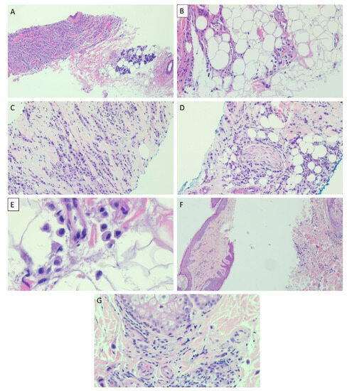 Histopathologic photomicrographs of a salivary duct carcinoma with rhabdoid features. A diffuse infiltrate of tumor cells is seen within parotid gland ((A), ×40) and in surrounding adipose tissue ((B), ×100). The tumor cells are disposed as single files ((C), ×100) and perineural invasion is evident ((D), ×100). Single cells infiltrating adipose tissue without supporting stroma, the tumor cells have a plasmacytoid morphology with eccentric nuclei and fine, foamy cytoplasm ((E), ×400). Skin biopsy shows infiltration of dermis and skin appendages by single cells with no appreciable stroma accompanying the tumor cells ((F), ×40) and ((G), ×400).
