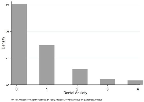 For the regression analysis models, the dependent variable, dental anxiety, was obtained from a five-point scale interview question and was converted from a multinomial categorical into a binary variable, where 0 represents people who reported ‘not anxious’ while 1 represents people who reported any level of anxiety: ‘slightly anxious’, ‘fairly anxious’, ‘very anxious’, or ‘extremely anxious’. The variable comes from the survey question that we ask: “how do you feel if you have a dental appointment tomorrow?” The purpose of this conversion was to improve the goodness of fit of the logistic regression model with the given data type and its distribution. In addition to the main independent variable, dietary patterns, gender, age, race, and education were controlled for. Gender is a binary variable, with 0 representing females and 1 representing males in the sample. The education variable is categorical and evaluates the highest education level completed. The race variable is a nominal variable with seven categories: American Indian or Alaska Native, Asian, African American, Hispanic, Native Hawaiian or Pacific Islander, White, and other. Age categories included 18–29, 30–39, 40–49, and 50 and above. The hypothesis is that different age categories are differentially correlated with dental anxiety. Since the categorical version of the dental anxiety variable is skewed (Figure 1), which can generate a bias, a binary version was used to obtain a more accurate measurement of dental anxiety. Data were analyzed using STATA 17 for sample size calculation, data processing and regression analyses, and SPSS 25.0. (IBM, SPSS Inc., Chicago, IL, USA) for Pearson’s correlation coefficient analysis.