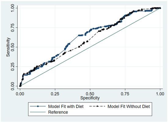 However, to better appreciate the power gained through the inclusion of dietary patterns in Model 2, a receiver operating characteristic (ROC) test was performed to compare both models’ fit (Figure 2). The ROC test helps to evaluate the performance of a binary logistic regression model based on the true positive rate against the false positive. In this figure, the top line represents Model 2’s performance, while the lower one represents that of Model 1. Model 2 classifies approximately 0.633 areas out of 1.000 under the 45-degree line, while model 1 classifies 0.600 areas out of 1.000. Therefore, compared to model 1, model 2 provides a better fit, which suggests that dietary patterns better explain dental anxiety than demographics alone. In other words, we can confidently reject the null hypothesis, which states the areas under the ROC of the two models are the same.