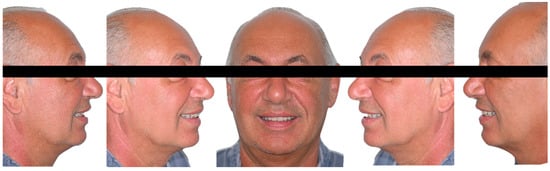 The patient presented a correct vertical dimension that was used as a reference during rehabilitation. Digital 3D scans of the complete removable denture worn by the patient (both the inner and outer parts) and the upper and lower arches were made with an intraoral scanner (CS 3600, Carestream Dental, Carestream Health, Atlanta, GA, USA). Intraoral and extraoral photographs were taken to create a customized virtual diagnostic wax-up, which was designed with dental computer-aided design (CAD) software (Exocad 3.0 DentalCAD, exocad Gmb, Darmstadt, Germany) (Figure 1 and Figure 2).