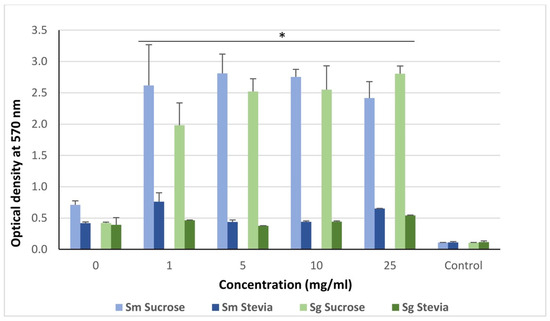 Crystal violet staining-based quantification of monospecies biofilms of S. mutans (Sm) and S. gordonii (Sg) treated with various concentrations of sucrose and stevia. Here, the control is culture medium (brucella broth) without Sm and Sg. The groups were compared by using Mann–Whitney U test. * p < 0.05.