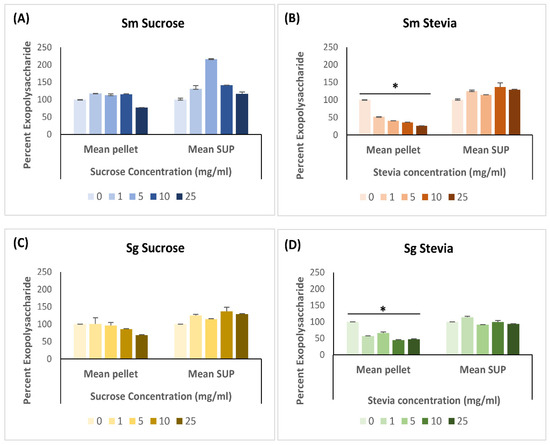The effect of sucrose and stevia on exopolysaccharide production from S. mutans (Sm) (A,B); and S. gordonii (Sg) (C,D) biofilms. Total carbohydrate content in biofilms and biofilm supernatants (SUP) were quantified by phenol–sulfuric acid method. The data were analyzed by Mann Whitney U test. * p < 0.05.