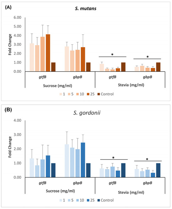 mRNA expression levels of gtfB and gbpB genes in sucrose- and stevia-treated biofilms of S. mutans (A) and S. gordonii (B). The data were analyzed by one-way ANOVA with Tukey post-hoc test. * p < 0.05.