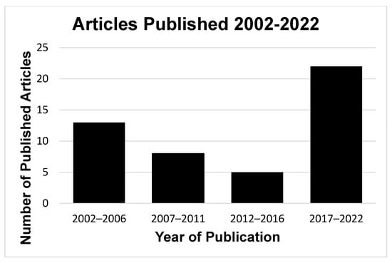 A total of 331 potentially eligible articles published over the 20 years up to November 2022 were identified using the search terms described. After screening titles and abstracts, 66 articles remained for further analysis. Full-text reading was undertaken, and 48 articles were finalised for inclusion in this review (Figure 1). The number of articles published initially declined from 2002 to 2016 when they were grouped in five-year intervals; however, there appears to have been increased research activity in this area more recently, from 2017 to 2022 (Figure 2).