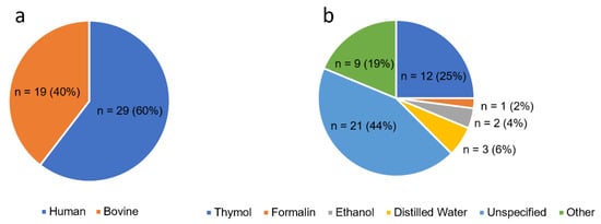 Either bovine or human tooth roots were used as substrates for the generation of root caries lesions, with the majority of studies using human tissue (60%) (Figure 3a). Among the studies, 19 specified whether the cementum remained intact or was removed from the root surface. Storage of teeth prior to use was mostly not reported in 21 studies (Figure 3b). One quarter of studies specified that specimens were stored was in a thymol–water solution in a concentration range of 0.08–1.0%. One study utilised a thymol–alcohol mix, while another study reported the use of a saline-containing thymol solution. Other solutions used for storage included formalin, sodium azide, 5% sodium hypochlorite, and ethanol. One study refrigerated specimens, whilst two studies froze specimens at −20 °C prior to analysis. Two studies described the immediate use of specimens following collection without storage, and one other study stored specimens in an airtight humidified container prior to use.