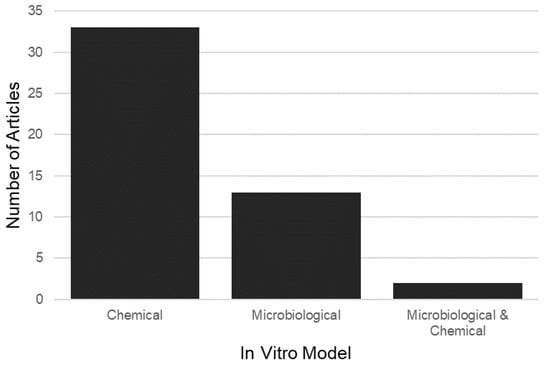 Chemical, microbiological, or a combination of both methods were used to induce artificial root caries (Figure 4). Chemical exposures were mostly utilised to create root caries lesions (69%). Of the studies, 33 exclusively used a chemical model system, whilst 2 studies used a combined chemical and microbiological model system. A microbiological model was exclusively used in 13 studies (27%).