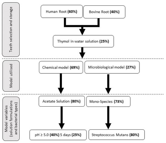 Flow chart showing frequencies of research methodologies used in in vitro studies for root caries model systems. The percentage values shown in the flow chart indicate the most frequently used procedures.