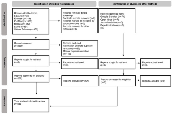 The searches conducted in the six databases resulted in 2569 scientific articles. After removal of duplicates, 1772 articles were totalled. The gray literature search resulted in 81 articles. After reading the titles and abstracts in the first phase, 288 articles were selected for the next phase. At the end of reading the full articles (second phase), 83 articles were included for the qualitative synthesis [23,24,25,26,27,28,29,30,31,32,33,34,35,36,37,38,39,40,41,42,43,44,45,46,47,48,49,50,51,52,53,54,55,56,57,58,59,60,61,62,63,64,65,66,67,68,69,70,71,72,73,74,75,76,77,78,79,80,81,82,83,84,85,86,87,88,89,90,91,92,93,94,95,96,97,98,99,100,101,102,103,104,105]. The review process is schematized in a flowchart depicted on Figure 1.