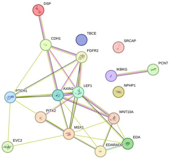 Seven studies reported mutations in EDA or WNT10A in HED, Christ–Siemens–Touraine syndrome, tricho-odonto-onychodermal dysplasia, and odonto-onychodermal dysplasia. Others studies have reported mutations in AXIN2 (HED), CDH1 (blepharocheilodontic syndrome), DSP (Carvajal/Naxos syndrome), EDARADD (HED), EVC2 (EVCS), FGFR2 (Beare–Stevenson syndrome), PCNT (microcephalic osteofysplastic dwarfism type 2), PITX2 (ARS), PTCH1 (basal cell nevus syndrome), IKBKG (incontinentia pigmenti), LEF1 (HED), MSX1 (Witkop’s syndrome), NPHP1 (juvenile nephronophtisis), SRCAP (Floating-Harbor syndrome), and TBCE (Sanjad–Sakati syndrome). Together, these genes participate in 80 biological processes and 19 pathways. The most significant biological processes were odontogenesis (GO:0042476; p = 1.56 × 10−7), gland development (GO:0048732; p = 7.29 × 10−6) and epithelium development (GO:0060429; p = 1.65 × 10−5), and the pathways were of pathways in cancer (hsa05200; p = 4.55 × 10−5), basal cell carcinoma (hsa05217; p = 4.55 × 10−5), and pathways of the gastric cancer (hsa05226; p = 4.55 × 10−5) (Supplementary Tables S3 and S4). The networks included 17 predicted interactions (Figure 2).