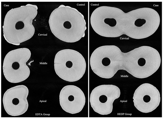 The middle layer of the cervical, middle, and apical thirds from two teeth in the EDTA and HEDP groups.