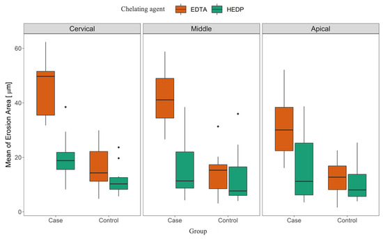 The repeated-measures (RM) ANOVA showed that there was a clear difference between EDTA and HEDP groups overall (p = 0.01) and that there was evidence that the case groups significantly differed from the control groups (p < 0.01). It also showed that position affected erosion, as already mentioned in the descriptive section (p = 0.01) (Figure 3).