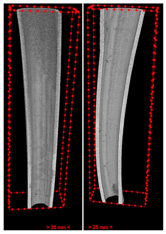 One of the strengths of our study is that it considered two roots of one tooth as control and case groups, because the hardness and biomechanical behavior of the roots may vary depending on the thickness of the dentinal wall, density of dentinal tubules, and the amount of intertubular dentine [46,47]. Another strength of this study is the approach to 3D measurements. Various initial attempts were made to automate these depth measurements, and the method utilizing AUC density emerged as the most suitable for semi-automated examination of the entire root.