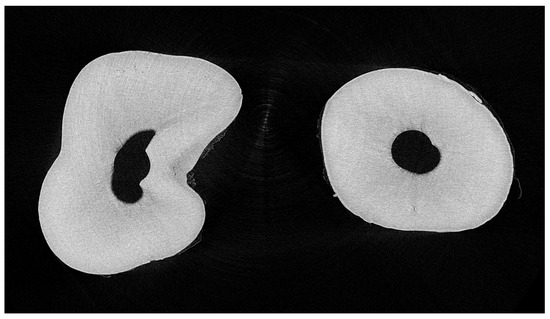 All analyses were conducted with the statistical software R, version 4.0.2 [43]. For 3D analysis, the area under the obtained density curve as from the µCT was calculated. A characteristic density over the whole area under the curve (AUC)—named AUC-density—was defined as the ratio of the calculated AUC divided by the area under the curve if the density was constantly 1. This is not equivalent to calculating the mean density out of all calculated density points as it is a smoother and more robust approach.