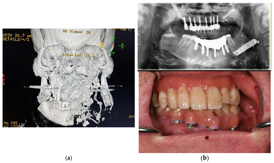 - Awadalkreem, F.; Khalifa, N.; Ahmad, A.G.; Suliman, A.M.; Osman, M. Oral rehabilitation of maxillofacial trauma using fixed corticobasal implant-supported prostheses: A case series. Int. J. Surg. Case Rep. 2022, 100, 107769. [Google Scholar] [CrossRef] [PubMed]