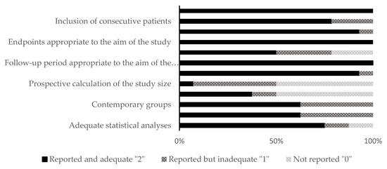 In clinical studies, the MINORS (“Methodological Index for Non-Randomized Studies”) tool was used [8]. This quality assessment tool consists of 12 methodological items. The first eight items can be applied to both comparative and non-comparative studies, while the remaining four items are applied only to comparative studies. The scores are “0” for not reported, “1” for reported but inadequate, or “2” for reported and adequate. At the end of the assessment, the total score should be calculated where the ideal score would be 16 for non-comparative studies and 24 for comparative studies.