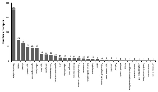 A total of 1117 specimens were collected in the clinical studies and the evaluation of the thermal effect of the used lasers was performed. All the specimens were collected for the diagnosis of oral soft tissue lesions. The histopathological diagnosis was reported for a total of 941 specimens, while 176 specimens were not clearly identified in four clinical studies. Figure 4 shows the distribution of the specimens according to the diagnosis of lesions. The overview and evaluation details of all included clinical studies are resumed in Table 3.