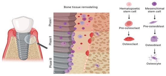 The most important long-term outcome is bone regeneration after peri-implantitis treatment [15,21]. Therefore, the surface should promote cell regeneration [22,23]. Data on the in vitro study of cell adhesion ability on various dental implant surfaces subjected to different processing methods during peri-implantitis are minimal. After the surgical access and cleaning of the implant surface from the bacterial film, it surrounds blood cells and bone marrow cells, forming a temporary bioactive layer. In the second phase, osteoclasts trigger bone tissue absorption a month later. Mesenchymal stem cells (MSC) and osteoblasts migrate to the osteogenic area on the implant’s surface and start proliferating, differentiating, and initiating the mineralization procedure. Approximately three months after the implantation (in phase three), osseointegration is in progress, and the implant surface is surrounded by osteoblasts and osteocytes (Figure 1). Mesenchymal stem cells (MSC) stimulate new bone formation during peri-implantitis treatment [24].