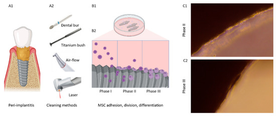Principal scheme of the experiment: implants isolated from peri-implantitis (A1) were treated with different cleaning methods (A2) and cultured in an MSC-containing hydrogel-based culture medium (B1). Mesenchymal stem cells attached to the surface (Phase I, (B2)), divided (Phase II, (B2,C1)), and differentiated (Phase III, (B2,C2)).