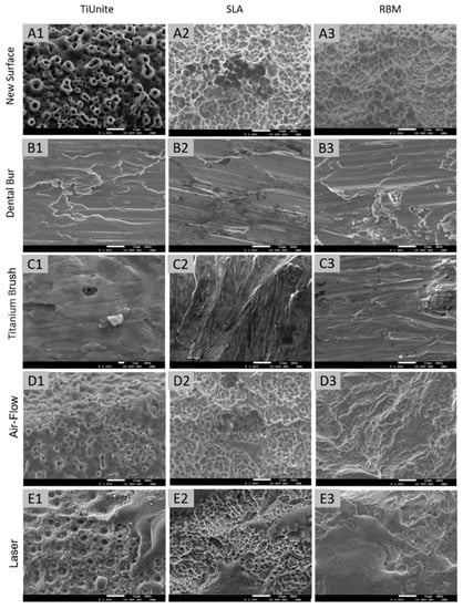 Impact of the cleaning method on the implant surface. Scanning electron microscopy (SEM) imaging of the surfaces of new untreated (A1–A3) implants TiUnite (A1), SLA (A2), and RBM (A3), as well as the implants from the same, manufacturers isolated from the patients with peri-implantitis and cleaned with different methods: dental bur (B1–B3), titanium brush (C1–C3), air-flow (D1–D3), and laser (E1–E3).