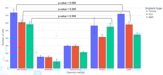 We were interested in the cleaning method with the closest results on cell adhesion to the implants with the new surface. Therefore, we searched for the most “indistinguishable” pairs of groups and calculated the p-value for this pair of groups.