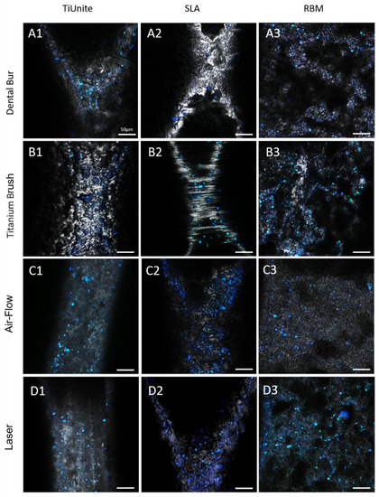 Mesenchymal stem cells growing on the surfaces of the TiUnite (A1), SLA (A2), and RBM (A3) implants isolated from the patients with peri-implantitis and treated with dental bur (A1–A3), titanium brush (B1–B3), air-flow (C1–C3), and laser (D1–D3).