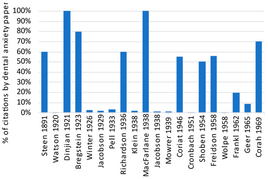 Table 1 shows the references that were potentially historical roots of dental anxiety identified with the cited reference analysis methodology described above. Upon closer examination of their contents, six of them were highly relevant to dental anxiety. Three were essays on the authors’ expert opinion or summary on dental anxiety [7,20,21], two were introducing psychometric scales to measure dental anxiety (Corah’s DAS and Frankl’s behavior rating scale) [15,22], and one was a semi-structured interview to reveal underlying reasons for having dental anxiety [23]. Meanwhile, the author had no access to three references [24,25,26], and therefore their citing papers were accessed to identify their citation context. Steen (1891) [26] was cited by three papers to support the notions that child dental anxiety has been investigated for over a century and that it involves parental influence particularly from mothers [27,28,29]. Dinjian (1921) [24] was cited by three papers in the analyzed literature set. All three papers cited it in their introductory paragraph as a reference that attributed dental anxiety to the expectation of pain [30,31,32]. Richardson (1936) [25] was also cited by three papers, in two of which as a reference to reject the abovementioned connection between dental anxiety and pain expectation [30,33], and the other one as a reference to suggest a waste of professional time resulted from ineffective management of uncooperative patients [34].
