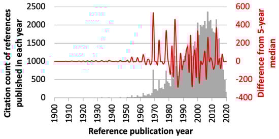 - Marx, W.; Bornmann, L.; Barth, A.; Leydesdorff, L. Detecting the historical roots of research fields by reference publication year spectroscopy (RPYS). J. Assoc. Inf. Sci. Technol. 2014, 65, 751–764. [Google Scholar] [CrossRef]