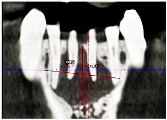A frontal image of the CBCT taken on the first appointment showing bone resorption (with a diameter of 20.97 mm width and 16.35 mm height) of the cyst in the middle of the lower jaw.
