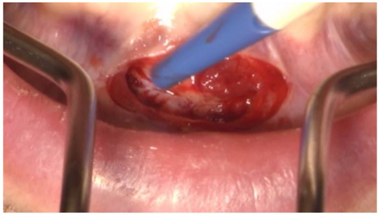 Intraoperative picture showing the dissection of the radicular cyst of the lower jaw in regio 31 to 41.