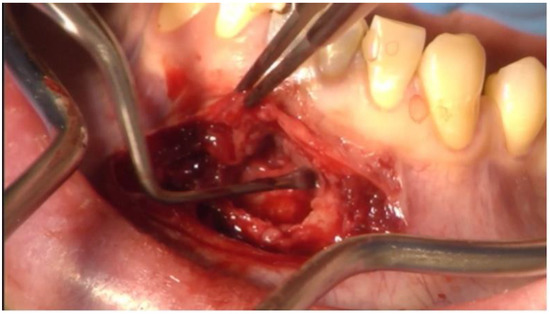 Because of spontaneous drainage of pus, Augmentin 1000 mg (1-0-1) was prescribed preoperatively for 7 days. Intraoperatively, lingual trepanation of teeth 31 and 41 was initially performed, and orthograde root canal treatment was performed using the crown-down technique with the EndoPilot (Komet, Salzburg, Austria) up to ISO 45 diameter. Working lengths of 19 mm at 31 and 16 mm at 41 were obtained. For additional chemical disinfection, the canals were rinsed with 5 mL of sodium hypochlorite (5%) and 5 mL of aqua. The left and right mental nerves were anesthetized using 3 ampoules of Septanest lidocaine with epinephrine (Septodont 1:100,000, Niederkassel, Germany). The incision was trapezoidal, as shown in Figure 3, with the base near the gingival margin and the subsequent formation of a mucoperiosteal flap to visualize the surgical site.