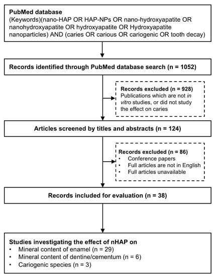 A literature search was undertaken in PubMed to identify English language publications from 2010 to 2022. The keywords included: (nano-HAP OR HAP-NPs OR nano-hydroxyapatite OR nanohydroxyapatite OR hydroxyapatite OR Hydroxyapatite nanoparticles) AND (caries OR carious OR cariogenic OR tooth decay).