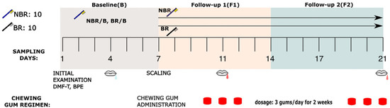 The 21 days of experimental protocol: The timescale (Periods of 1-week Baseline: B, 2-week chewing of anthocyanin gum in three pieces/day dosage. Follow-up 1 and 2: F1 and F2) of the experiment demonstrating the clinical procedures and sampling appointments. Scaling was made on the last occasion of B period, whereafter the participants started to chew the gum. After scaling made on the 7th day of B period, 10 subjects were randomly classified into NBR (who changed the toothbrush after scaling) and 10 into BR groups (subjects who did not change their toothbrush after scaling), and they got sour cherry chewing gums in three pieces/day dosage. The groups differed only by changing the toothbrush or not after scaling. The text under sampling days shows the actual intervention made at that time. During the B period (B: Day 4), sampling was made without sour cherry chewing gum usage (mouth with colorless drop). The chewing gum usage and sampling of the F1 and F2 period (F1: Day 4 and F2: Day 7) is shown by a mouth with red drop.