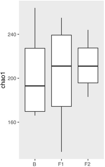 Distributions of chao1 (alfa) diversity values in different patient groups (B: Day 4 of the one-week control period, F1: Day 4 of the first week, and F2: the last day of the experiment).