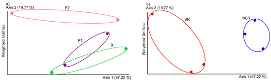 The MDS plot according to different time periods (B; F1 and F2 sample pools) showed overlapping clusters (B and F1), while the sample pools of F2 proved to be well separated from the others (Figure 4a) so the time does not seem to have remarkable effect at the beginning of treatment.