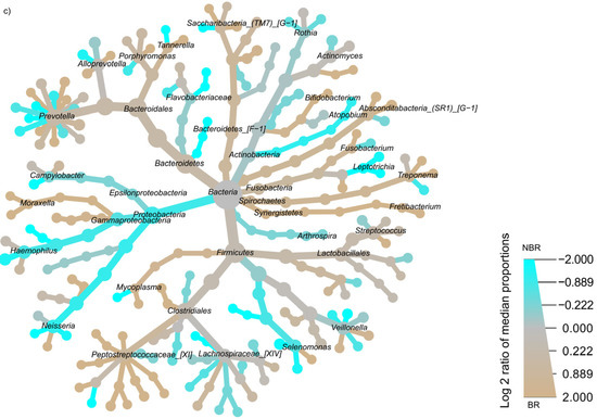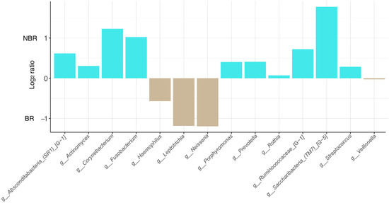 The genera Absconditabacteria_(SR1)_[G_1], Corynebacterium, Fusobacterium, and Saccharibacteria (TM7) [G-5] showed the highest log2 ratios in the NBR, while the BR contained mainly Leptotrichia, Neisseria, and Haemophilus.