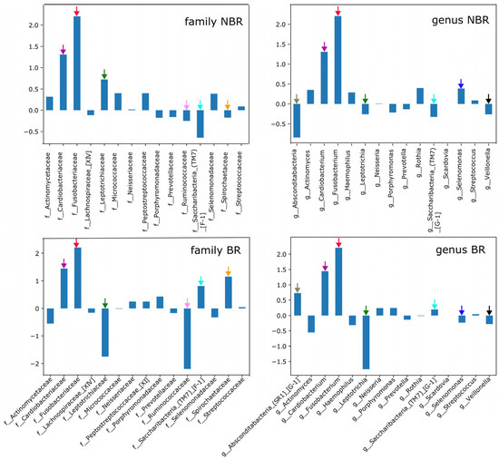 The log2 ratio of Leptotrichiaceae (NBR/B: 0.724, BR: −1.75) was less high in the control period of NBR group, and the genus Leptotrichia (NBR: −0.261, BR: −1.75) changed the same way. The opposite tendency could be observed in this family in case of BR (−1.75) and also in the NBR/B (0.724) at family level.
