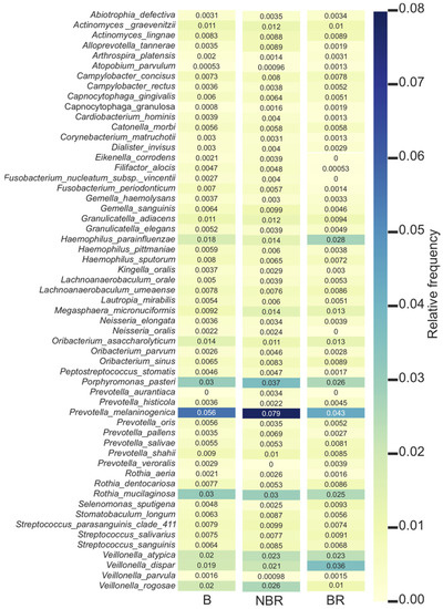 The genus Actinomyces (NBR/B: 0.354, BR: −0.553) was represented in higher levels during the NBR/B than after scaling in NBR, but in BR, opposite changes could be observed.