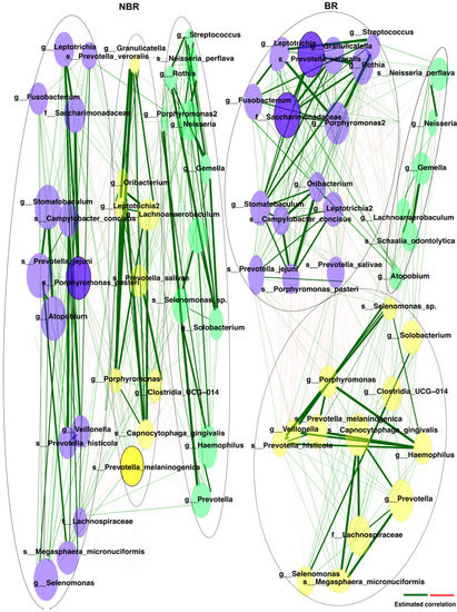 Dissimilarity-based networks were generated to compare community dynamics of the oral microbiota of BR vs. NBR samples. Green lines estimate positive correlations and red lines refer to the negative correlations. The thickness of lines shows the strength of correlation. The node colors represents different microbiota clusters: purple—cluster 1, yellow—cluster 2 and green—cluster 3.