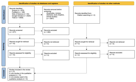 PRISMA flow chart of literature search results (please note that two publications reported separate in vitro and in vivo studies).