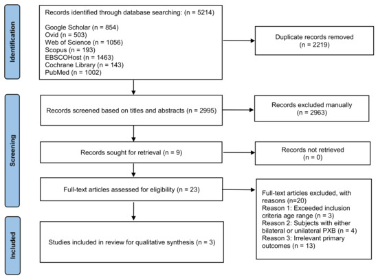 As illustrated in Figure 1, from the initial search, 5214 articles were identified. Deduplication removed 2219 records and eliminated 2963 after screening of the title content and abstract. The full-text assessment was carried out on 23 articles in compliance with the inclusion and exclusion criteria. Three studies that complied with the inclusion criteria were included in this study. The main reasons for exclusion were as follows: