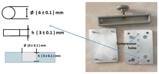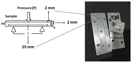 Before the preparation of the MMA composite, two types of molds were designed, each for DTS, as shown in Figure 1, and Flexural and ME, as shown in Figure 2. The mold was coated with Cold Mold Seal (CMS) before inserting the paste into the hole-shaped design. The polymerization was made by introducing an initiator of Benzoyl Peroxide into the suspension while keeping the suspension heated at 90 °C for 10 min until the solution turned into a paste. The paste was immediately poured into the peg mold and pressed to form the desired shape. The molding was placed in boiling water at 90 °C for 1 h, according to Wang et al. [35]. The other samples of SiO2/ZrO2/TMSPMA, ZrO2-SiO2 mixed/MPTS, and ZrO2-SiO2 mixed/TMSPMA were prepared with similar methods with different fillers and silanes. All composite samples were analyzed in terms of chemical bonding, crystallinity, and mechanical properties (DTS, Flexural, and ME) correspondingly using FTIR spectrometry (iD5 ATR, Nicolet iS5, Thermo Scientific, Waltham, MA, USA) in a wave number range of 4000–400 cm−1 at room temperature, X-ray Diffraction (XRD, Bruker D8 Advance with Cu Kα with = 1.54060 Å), and LLOYD Instrument (Type: LRX Plus, Ametek Company, Segenworth East Fareham, Hants, UK).