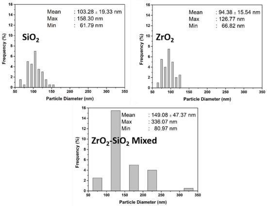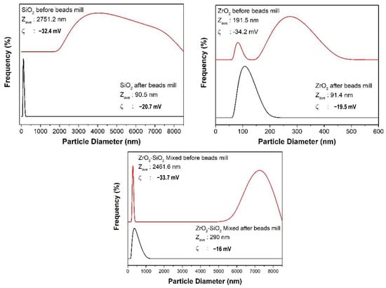 The size distribution of the synthesized particles before and after bead milling is presented in Figure 3. Particles appeared to agglomerate before bead milling, but agglomerated particles could be disintegrated after bead milling. In contrast, the nano-sized SiO2 and ZrO2 were obtained after bead milling, correspondingly, 90.5 and 91.4 nm. The ZrO2-SiO2 mixed particle was submicron sized (290 nm) after the bead milling process. The well-dispersed suspension was obtained for SiO2 nanoparticles due to the high zeta potential −20.7 mv to prevent deagglomeration of particles during the bead milling process. The suspension of ZrO2 and ZrO2-SiO2 mixed particles received lower zeta potentials, causing some particles to deagglomerate and form larger sizes during the bead milling process [37]. Consequently, the higher size distribution of both suspensions was obtained compared to the SiO2 suspension.