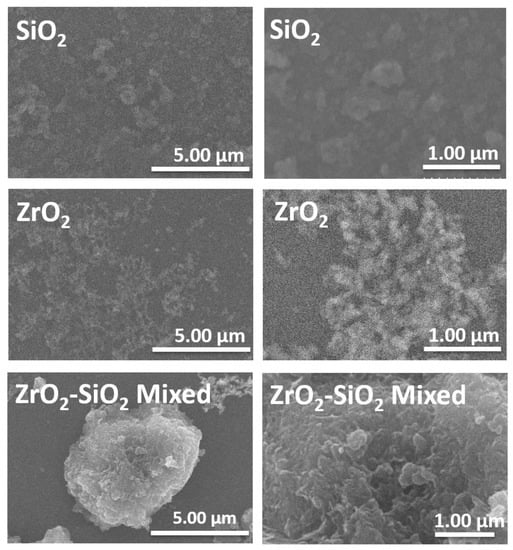 The SEM images of SiO2, ZrO2, and ZrO2-SiO2 mixed fillers.