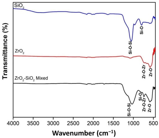 Figure 6 shows the FTIR SiO2, ZrO2, and ZrO2-SiO2 mixed after the bead milling process. The FTIR of SiO2 fine powder has two prominent characteristic peaks, observed at about 793 cm−1 and 1050 cm−1, namely Si-O bending vibration band and asymmetric stretching vibration siloxane bonds (Si-O-Si) [38]. This result confirmed the formation of SiO2 and its functional groups via sol–gel synthesis. SiO2 nanopowder was produced after undergoing the sol–gel process with typical reactions of hydrolysis and condensation of precursors. The TEOS precursor was first hydrolyzed to silicic acid during the sol–gel process. Then, the condensation reaction led to the formation of Si-O-Si bonds. The high deformability of the formation allows the inorganic gel to accommodate significant shrinkage, which prevents cracking and pulverization of the powder during drying and calcination.