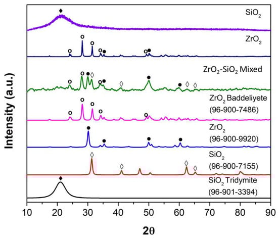 Figure 7 shows the XRD spectrum of the SiO2, ZrO2, and ZrO2-SiO2 mixed samples compared with the reference spectrum based on Crystallography Open Database from Match version 3.6.2.121 software Crystal Impact, Bonn, Germany. The crystal structure of the SiO2 sample appeared to be triclinic (anorthic) Tridymite based on COD 96-901-3394, while O2 appeared to be a monoclinic Baddeleyite based on COD 96-900-7486. Meanwhile, the crystal structure of ZrO2-SiO2 mixed appeared to be a combination of crystalline tetragonal SiO2 Stishovite (COD 96-900-7155), monoclinic ZrO2 Baddeleyite (COD 96-900-7486), and orthorhombic ZrO2 (COD 96-900-9920), with ratios of 46%, 37.3%, and 16.7%, respectively.
