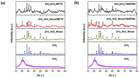 XRD composite post with silane addition: (a) MPTS and (b) TMSPMA. XRD spectra references are SiO2 Tridymite/COD 96-900-7155 (solid square) and ZrO2 Baddeleyite/COD 96-900-7486 (solid circle).